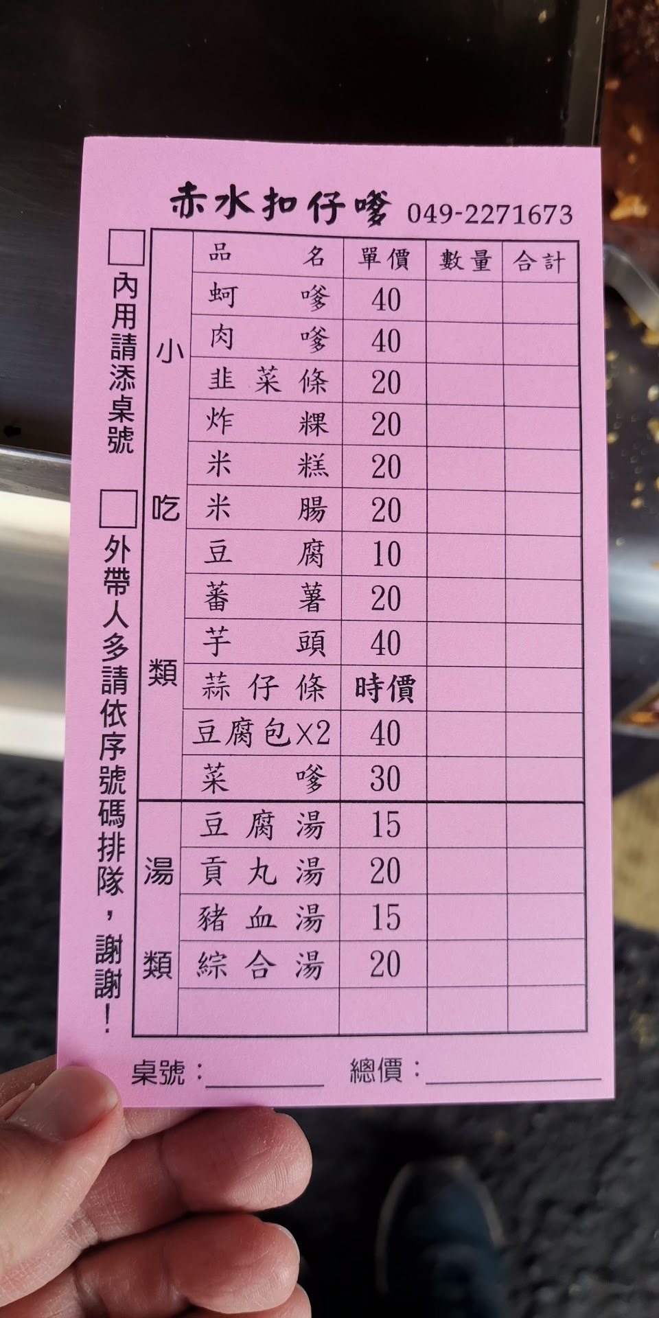 東西超級貴!我叫了扣仔嗲、米腸、久菜捲共三個、一碗豆腐湯及拿了一瓶lO元紅茶,竟然收我160元。當時有點驚訝不想吵架就付錢走人,事後愈想愈貴。