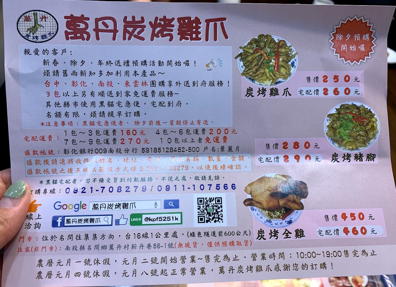有雞爪、豬腳跟全雞都嚐試過了,調味都一樣,蒜味濃,重口味,木炭烤透了都膠質滿滿,目前只有感覺雞爪比較合胃口,熱熱的好吃,冷掉就不好吃。全雞有吃到一邊雞皮都燒焦,可能火侯掌控得不是很好。論包裝跟熱度與熟度都不錯,提供紙箱外帶保溫送禮都方便,醬汁應該算是獨家配方吧,偶爾吃還不錯。常常遇到排隊,路邊停車或走路注意安全,請遵守交通規則。