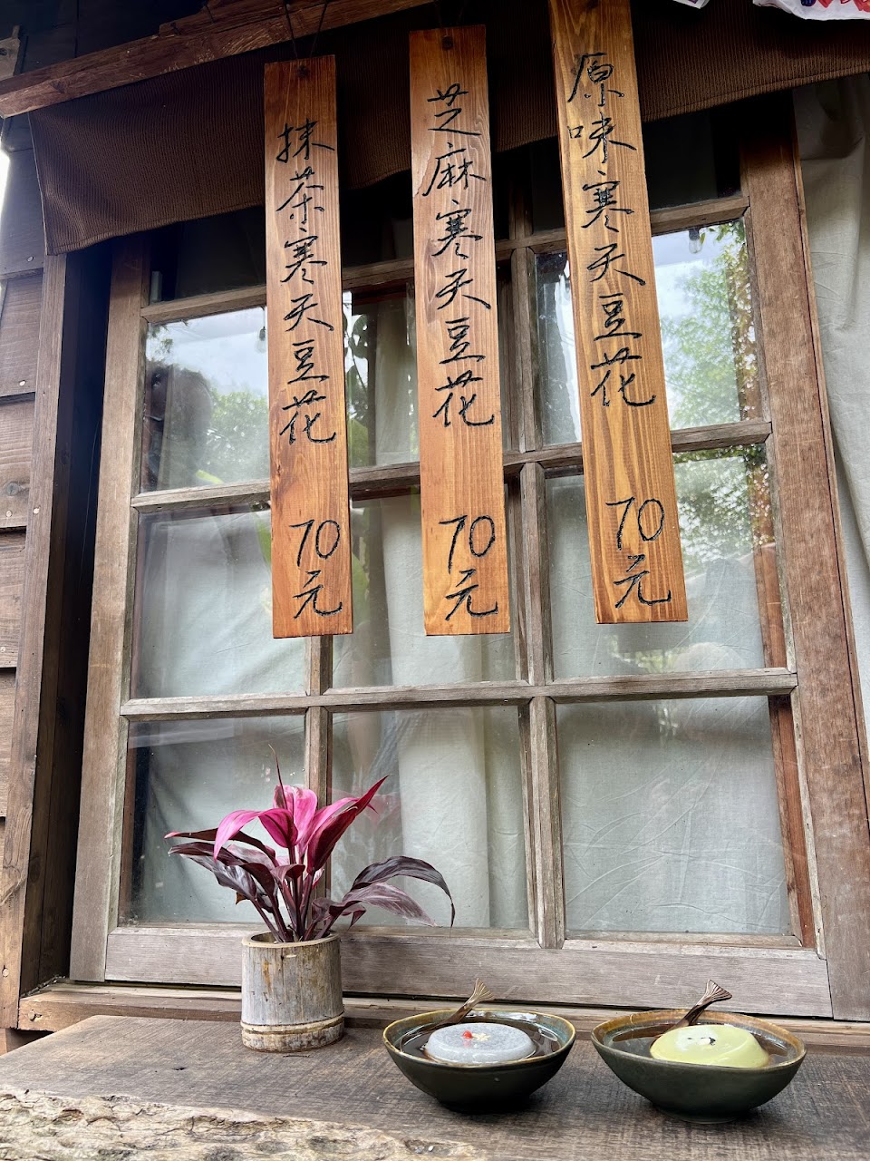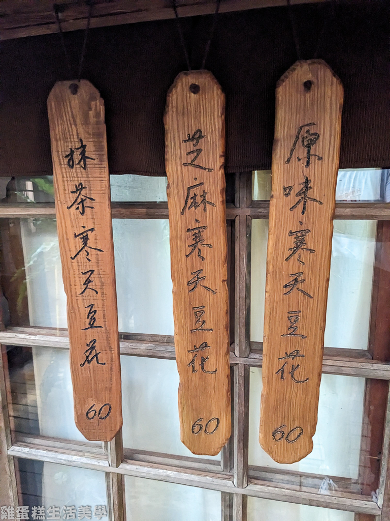 寒天豆花好吃,尤其在日式容器、日式建築的大樹下食用,別有風味。