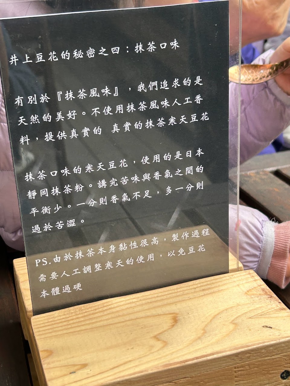 高質感的木碗中,香嫩清爽的豆花,滑溜溜在金魚匙上,入口即化,微微的甜甜的一笑。