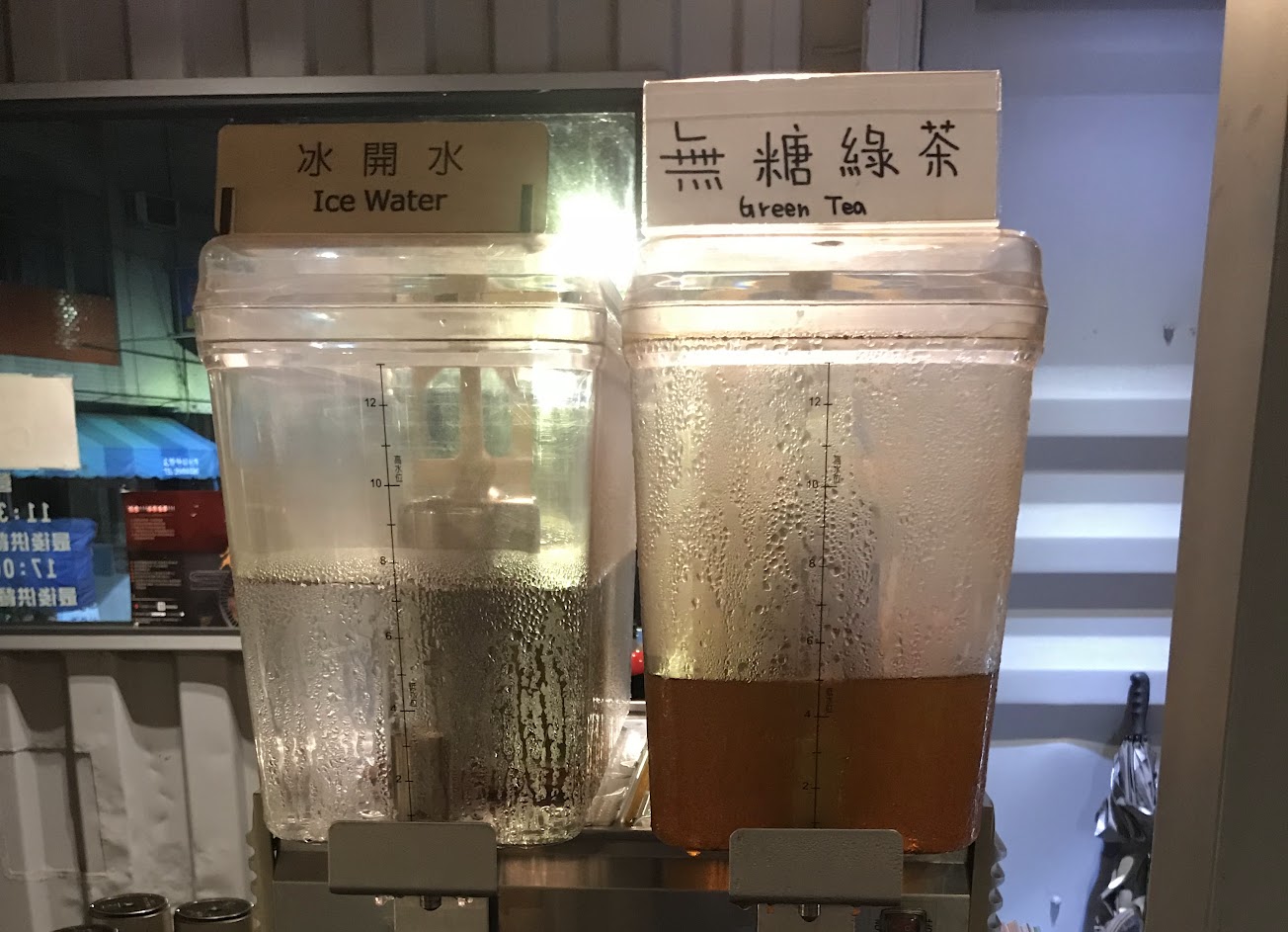 店內提供真茶葉泡的無糖綠茶免費暢飲,
