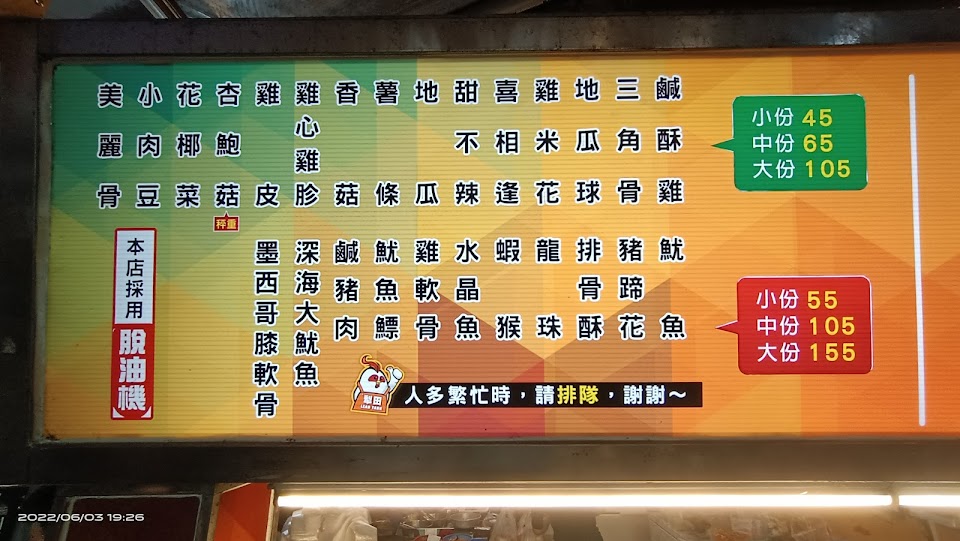 每次經過都很多人,剛剛經過時看只有2個人在等,於是買了三樣炸物,卻等了很久。總結,原來是動作不快,而造成門庭若市的感覺!