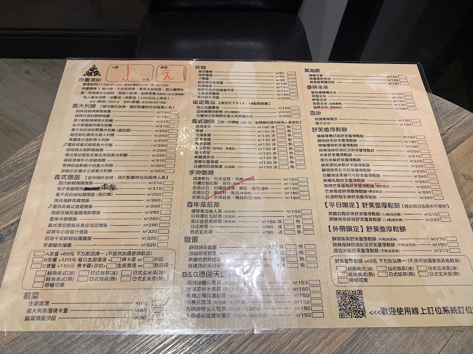 之前經過想吃 但是沒有預約 又是假日 候位至少有6組 時間無法確定打消念頭 昨天突然又想吃 看官網上面的預約已經要約到4天後 所以打電話詢問 候位有2組 因為過去大概30分鐘 所以就直接過去了 去到現場 只有一張凳子 前面還剩一組候位 大概等了30分鐘才進去 所以建議想吃的提早預約 會直接打電話詢問 用餐時間2小時 店員這方面會控管比較嚴格一點 空位的部分 店員都會放上預約牌 店員會詢問有沒有來過 簡單介紹餐具都是自助式 點完餐後吧檯先結帳 昨天在現場 衛生紙沒有 店員不會補 只會叫你去後面拿 現場店員至少有5位 好像都有自己負責區域 評價上看到廁所很髒味道很重 昨天進去真的是味道很重 而且衛生紙都掉在地上 感覺就是沒在整理 已翻桌率高的餐廳 建議1~2小時整理一次 裡面也沒有衛生紙 跟餐巾紙 有點可惜廁所看起來算不錯 感覺店家都有回復一些評價 但是廁所方面真的沒有改進 送餐時間算慢 義大利麵分量很多 女生吃不多的人 可以2人吃一份就好 昨天在吃義大利麵時 店員過來詢問可以開始做舒芙蕾嗎 施作時間大概20分鐘 但是義大利麵分量很多 所以還沒吃完舒芙蕾已經上桌了 舒芙蕾在吃得時候已經有點冷掉了 2人桌子來說 會有點小 3個盤子 2杯咖啡就差不多了 室內空間狹小 客人間的距離很近 客觀來說 義大利麵可以很好吃 會想再訪