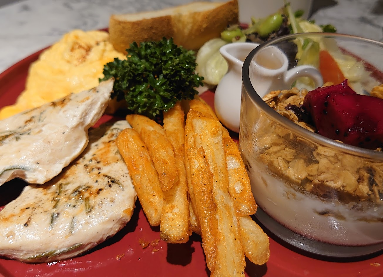 雞腿排外皮煎到微微脆,醃過的雞腿肉吃起來不乾柴、鮮嫩多汁,早午餐份量上很足夠,連搭配的優格、沙拉都超美味?