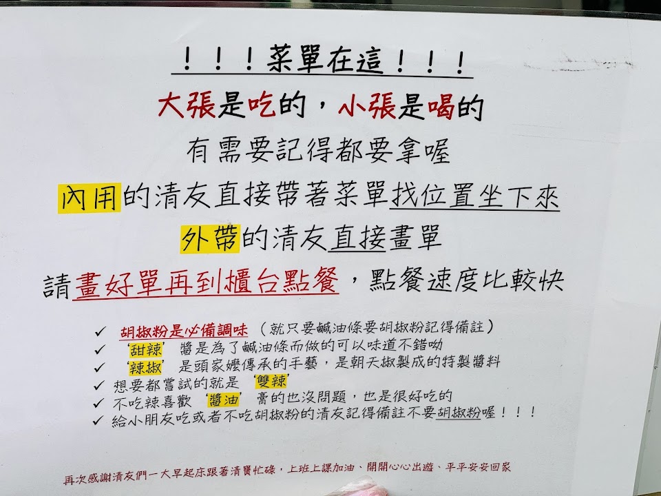 購餐程序 平日的上午九時多來的,也要排隊購買!結帳的小姐姐在點餐時就先講要等半小時,原願意接受再點餐。點餐後給號碼牌,依序叫號提供餐點,幾乎都是鹹油條要等,其他餐點他們也會盡快上桌供餐。
