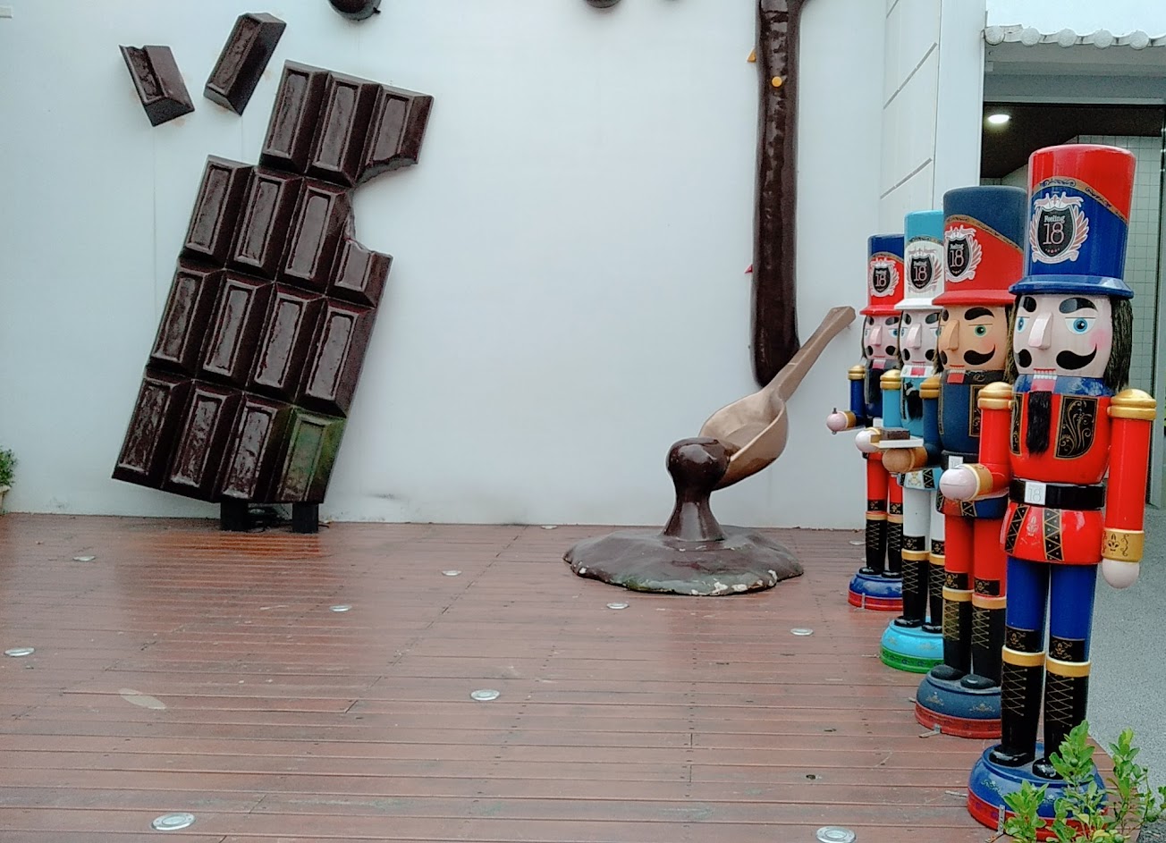 是另類的一個觀光小景點。這裡有奉茶可以自備環保杯,像是喜歡喝茶或是咖啡都可以拿自己的杯子或保溫瓶跟奉茶處的店員討要杯來喝唷!(之前是會提供紙杯免費拿來喝。)這是免費的~周遭都還有一些甜點小舖,像是鯛魚燒、泡芙、布丁。還有這個地方專門在賣的巧克力。有分很多種口味、濃度、或是有酒味、花果味,旁邊也有冰淇淋。也有分很多種口味,這邊的外觀建築比較屬於白色巧克力的點綴、也有小小甜點屋,外觀種植綠色的植物加上白色的建築讓人感覺非常舒服。外面也有胡桃鉗娃娃很鮮豔,小朋友更喜歡這種深入其境的巧克力世界吧!呵