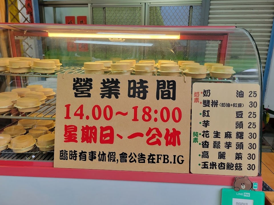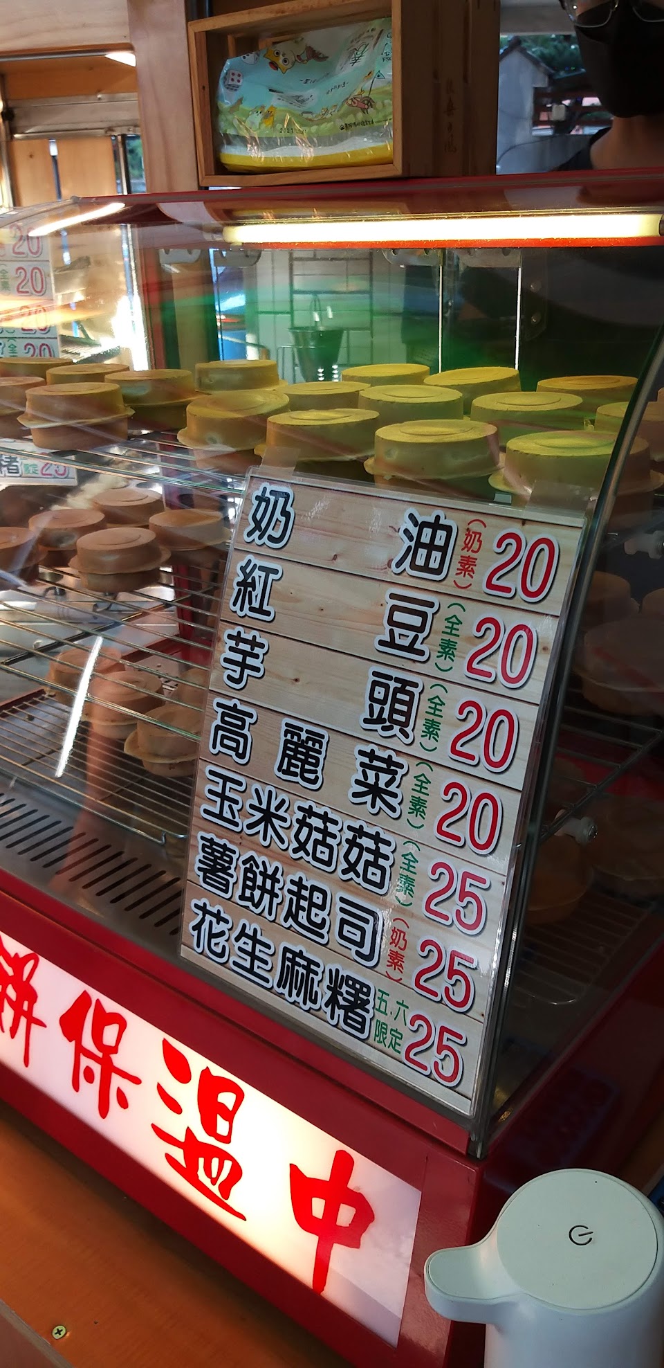在地老闆推薦的巷子裡的銅板點心,口味包含甜、鹹兩種,純素口味選擇算多,一般較少見,還有保溫箱。