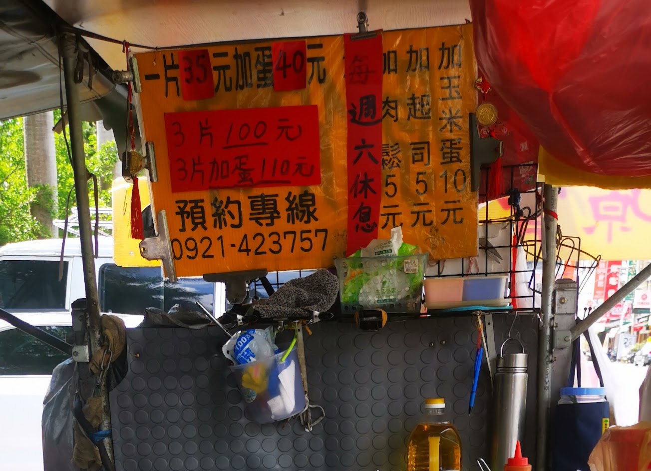 生意超好,排隊半個多小時才買到,可能跟阿惠蔥油餅沒開有關,想吃的人全部擠到小貨車旁排隊,這家優點是便宜,老闆的記性相當好,誰先來的不會搞錯,如果能夠不要那麼油,然後皮再煎脆一點就更好了,太軟吃起來口感像蛋餅。一片35元,加蛋只要加五元,三片一百,有加蛋的三片110元。攤位後方的鞭炮花開了,象徵過年快到了。