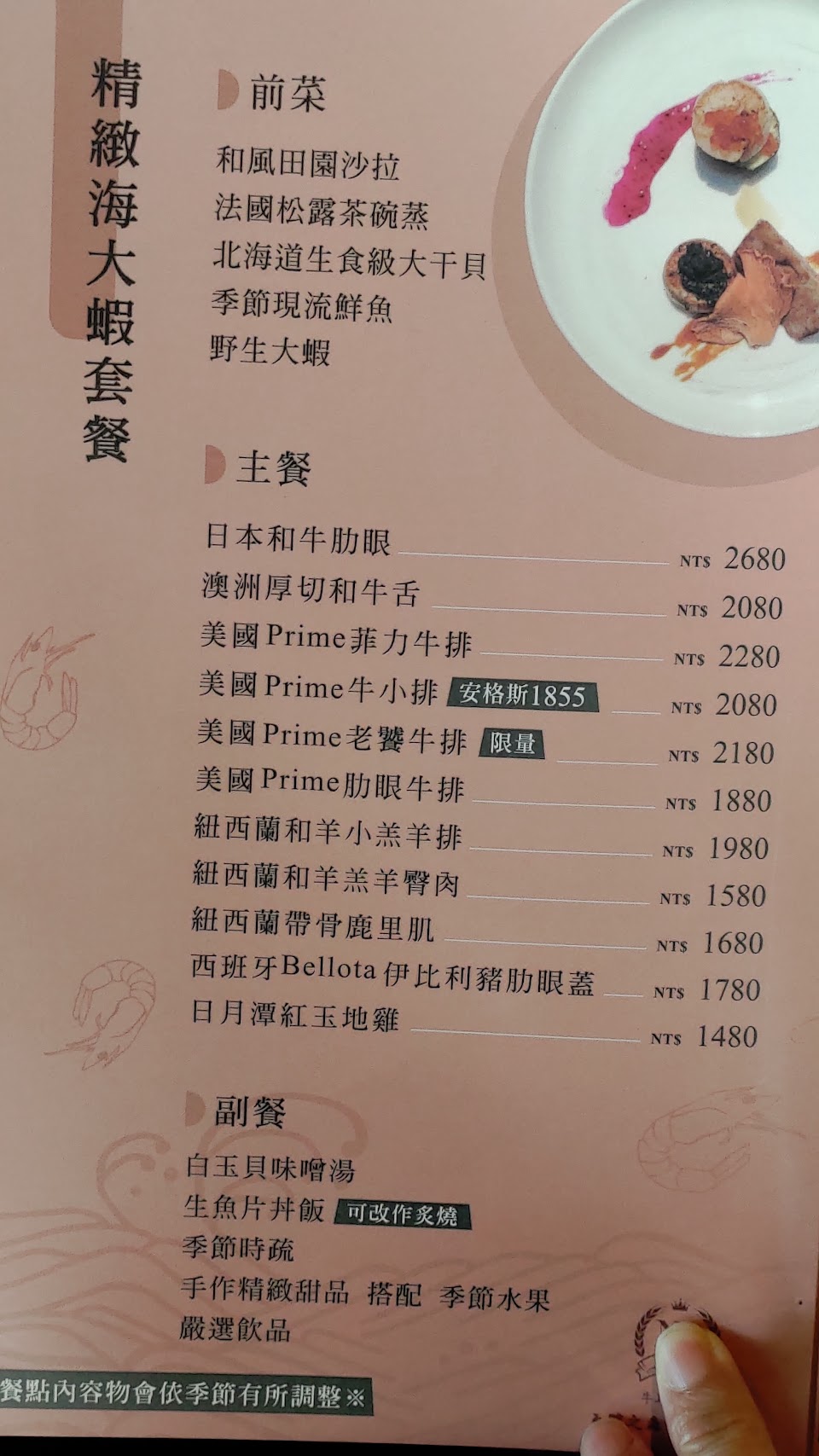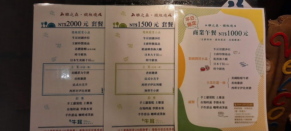 分三種價位 1000、1500、2000 這次點1500和2000元,都非常的滿意! 食材新鮮,用料實在,覺得物超所值 每道菜都像是主菜,吃得非常飽 特別印象深刻的是牛排佐蔬菜串竟然還配上法國鵝肝(2000才有鵝肝),鵝肝煎得很香,一口吃下去簡直就是幸福的味道~ 另外還有刺蔥烤龍蝦(1500是焗烤明蝦)、南瓜炊藜麥飯非常香