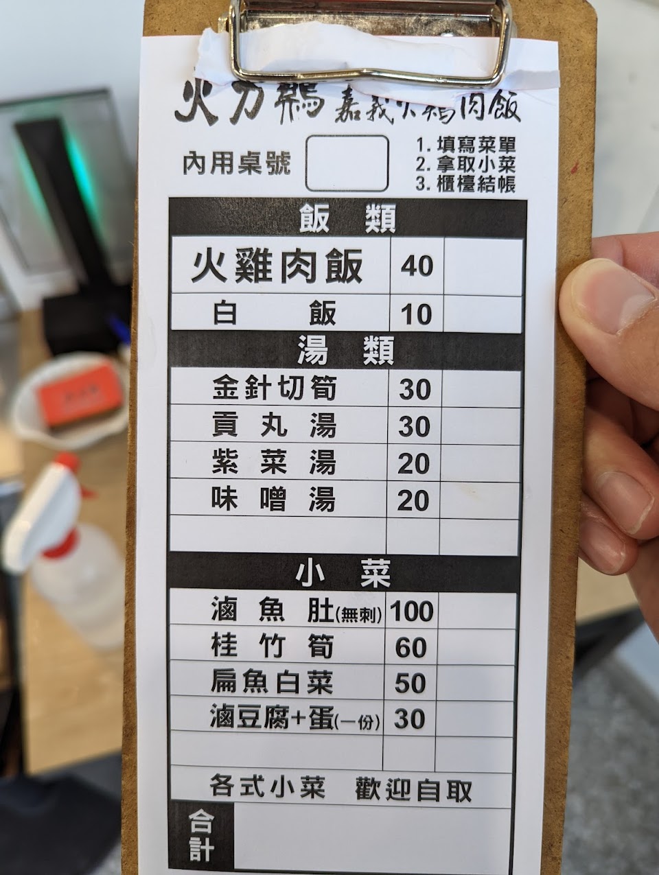雞肉飯、 貢丸湯、 紫菜湯、豆腐+魯蛋 餐點ok 用餐環境ok