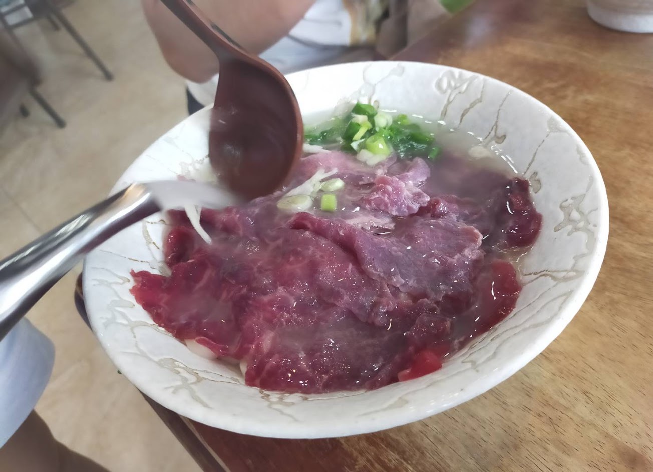 送上來,生牛肉才淋上熱湯,湯頭鮮甜,牛肉軟嫩,真的太好吃!