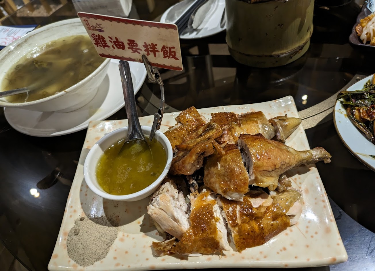 餐點的話 價錢不算很平價 畢盡是店面有冷氣的 加人事費用可以體諒 點了主角甕缸雞 和一些小菜 也有點湯類 服務人員有提醒 如果烤雞 整隻的會有附湯 這樣還需要湯類嗎 這一點值得鼓勵加分 出菜算很快沒附白飯 雞油不要浪費 要加到白飯 道是 魚蝦雙拼個人不推不夠酥香 小魚刺還會刺人都吃沒多少。