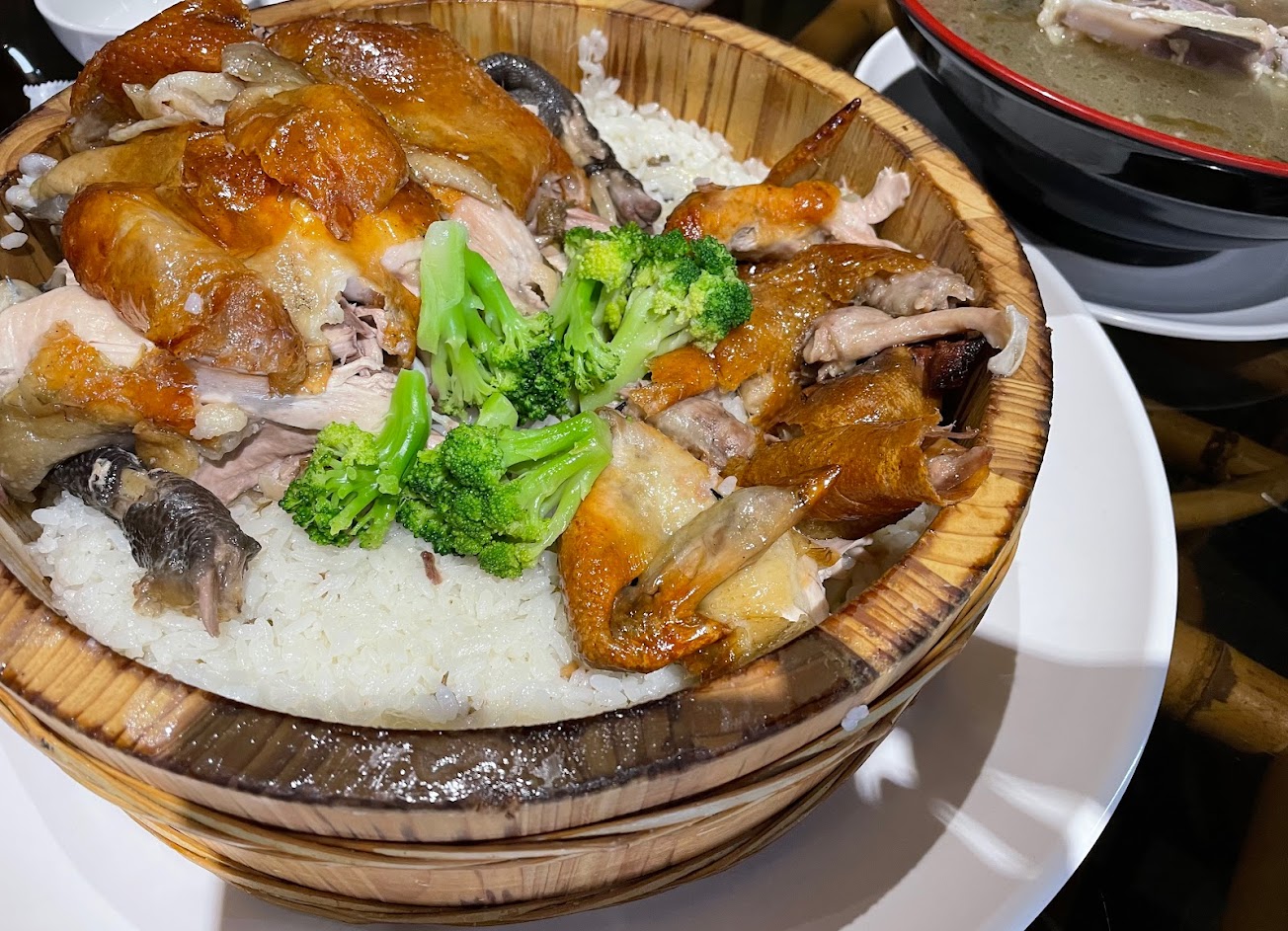 這盆飯吃過就讓人難忘,烤雞很好吃!菜盤也很豐盛,會送雞湯,小朋友也超愛吃。