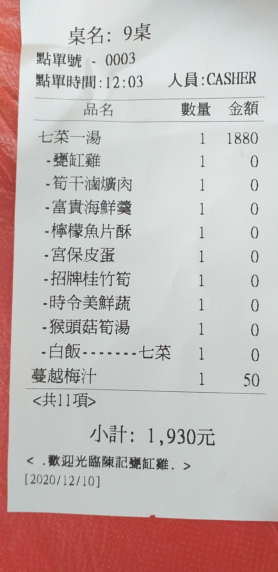 點餐時說沒飯了,要等半小時,結帳卻發現沒算到甕仔雞,於是再跟我們收錢,之後菜都上了,飯也來了,就是雞不來,結果一問之下才發現櫃台收了錢卻還是沒把雞點進去……最終還是沒有吃到甕仔雞? …