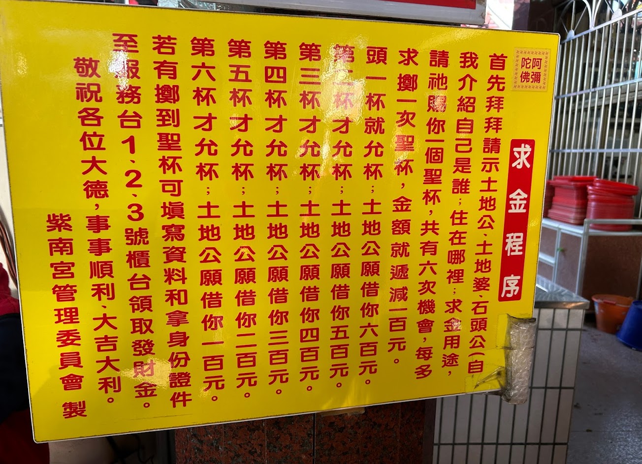 可以筊杯借發財金,從$600ㄧ路筊杯到$100,如果沒聖杯,也可以花$3600買個金雞回家~