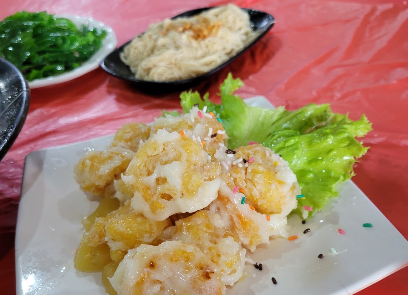 出菜很快,料理也都很平價實惠,有兩間店,在兩間分店用餐經驗差不多,都是屬於平價好吃的,店內空間一樣大,也都附設有停車位,用餐很方便。隨手點的這幾道菜都沒地雷(只有溪蝦有點尖刺食用時要小心)每道菜份量足夠且味道也符合自己的口味,雞油飯也不會太油太鹹,鹹度適中且很香,額外還送了飯後水果茂谷很甜很好吃。現場遇到的工作人員服務態度很好,上菜及詢問問題都親切立刻回答,蝦球要麻煩醬額外分開也有幫忙記得,很感謝。