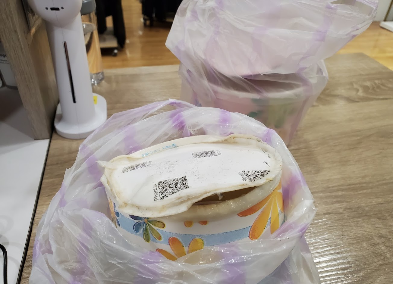 紙碗碗底整個破裂,整碗海鮮雞絲麵漏在塑膠袋裡是什麼概念