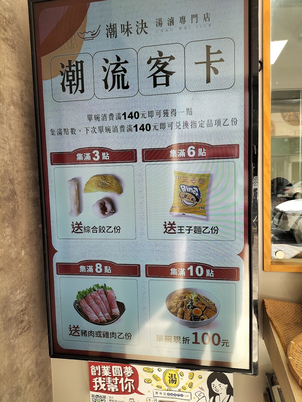 口味不錯,且有多種口味可以供選擇,食物也都好吃,辣椒有蒜頭也很好吃,但湯比較少,又不確定可不可以加湯,後面外帶的顧客被告知說湯多一點的話味道會變淡,現場詢問加湯也有點為難的說可以幫忙加一點點。現場環境乾淨整潔,用餐起來很愉快,現場也有一些套餐可以供選擇,也有一些活動,像是積點,價位還ok,下午時間沒有休息,很方便