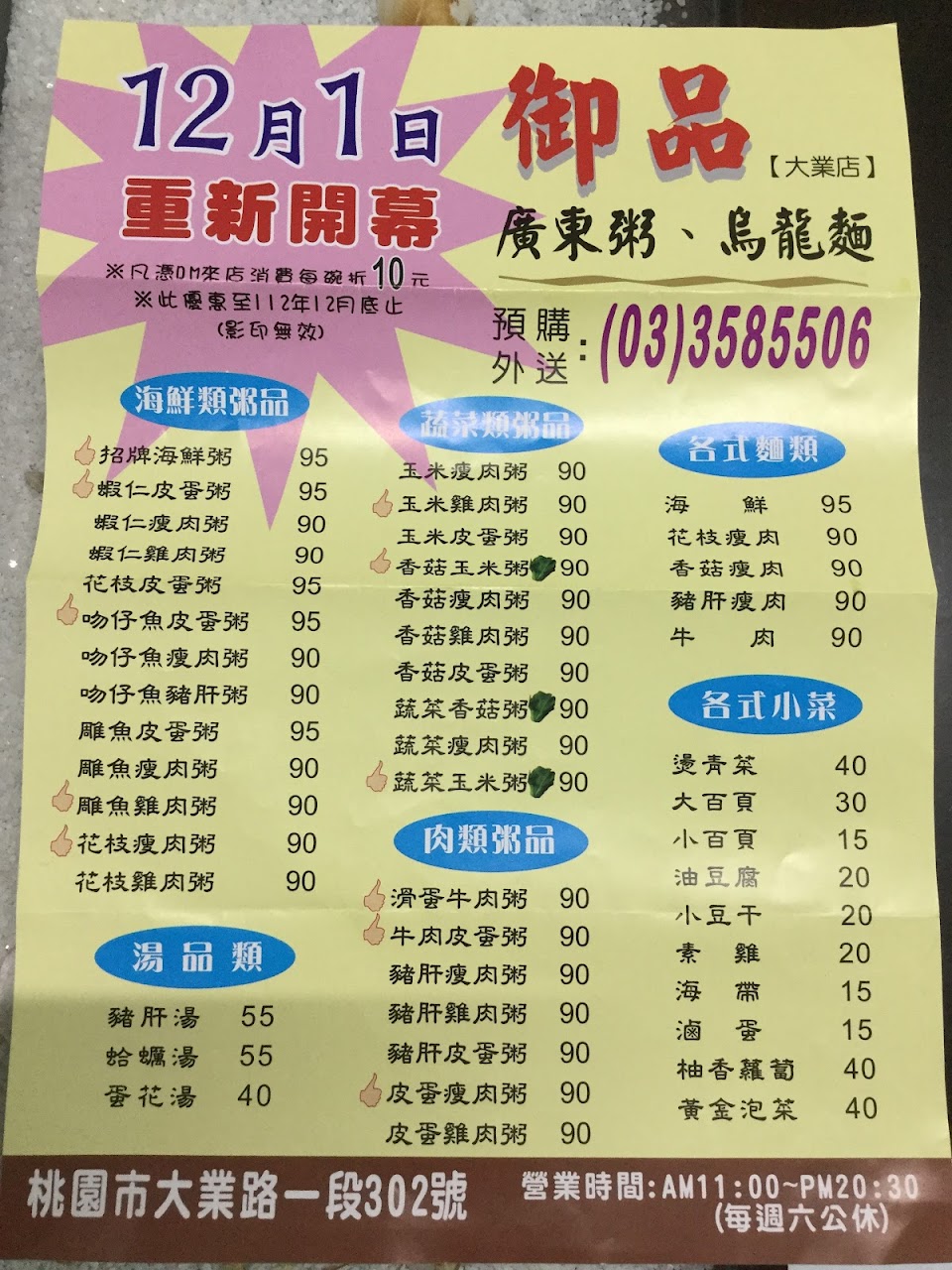 2024最新在地推薦餐廳的菜單_御品廣東粥 (桃園大業店)的菜單、圖片
