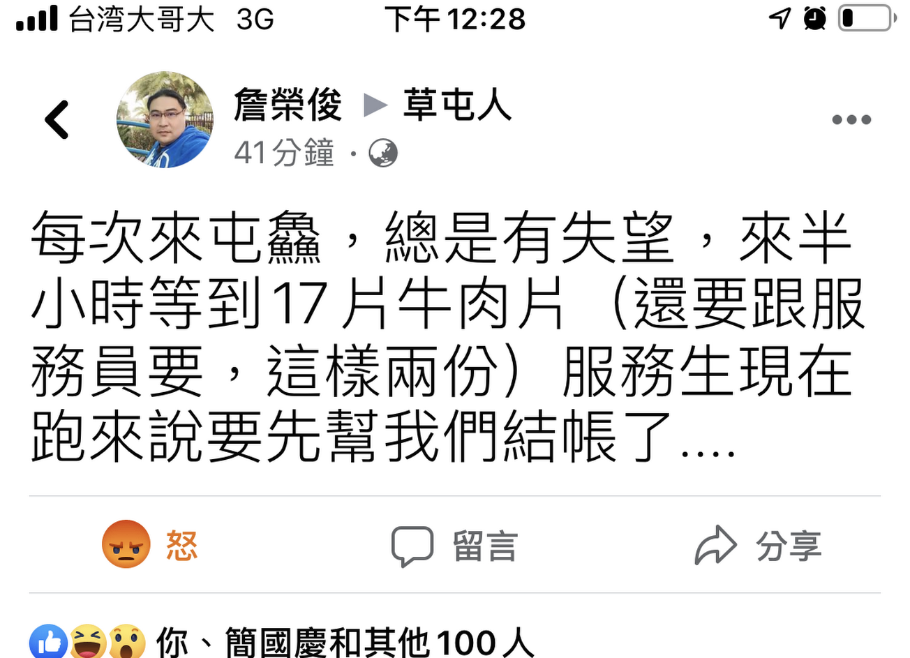 9/4日前往消費,要放夾子等肉, 等30分=兩份雪花牛=2口, 才吃兩口肉,服務生說來要先幫我們買單 貼FB草屯人還被刪除!