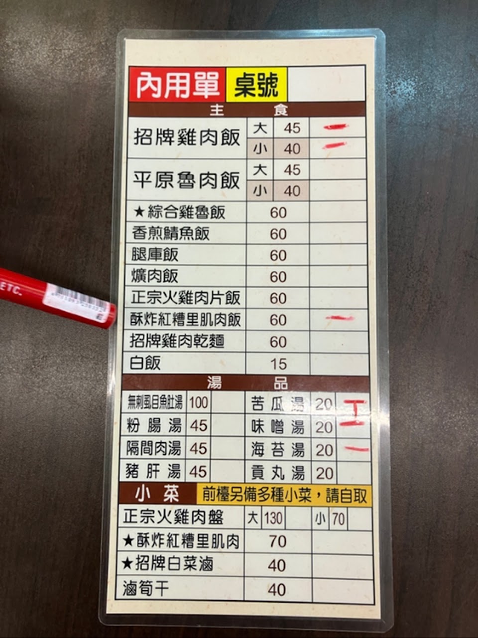 上面貼著請先付款,結果要付款時說等等吃完再付,那幹嘛還貼請先付款阿 還有一道小菜涼拌鳳爪裡面只有四塊小鳳爪!?其他都是小黃瓜賣50$原來現在物價這麼高了 (更新)原來菜單是劃好看的啊,那請先付款可以撕掉了哦,你還沒回四塊小鳳爪+小黃瓜50$是正常的!?四塊+起來可能只有一支吧