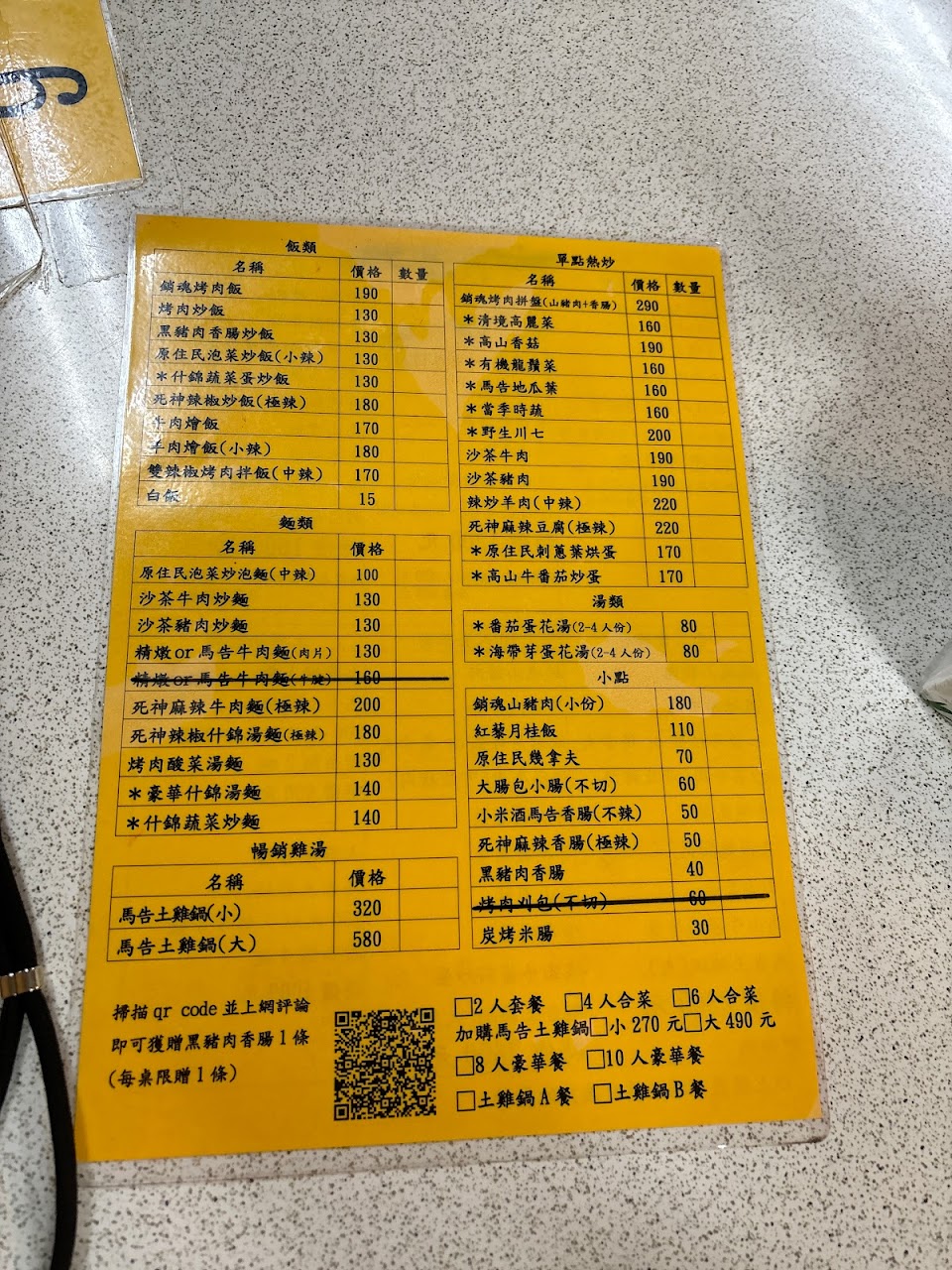 兩人套餐菜色普通,味道普通,馬告香腸,馬告土雞鍋也普通,食物沒原住民的風味,平價沒原鄉