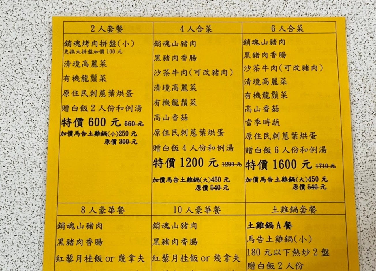 CP值非常高兩人套餐適合三人吃,兩人吃會過飽,馬告香腸和山豬肉非常Q彈,高山蔬菜非常甘甜,唯一美中不足的是土雞肉有點柴,可能是當天老闆比較忙肌肉部分有點小疏失,不愧是清境農場附近上班族用餐好去處!