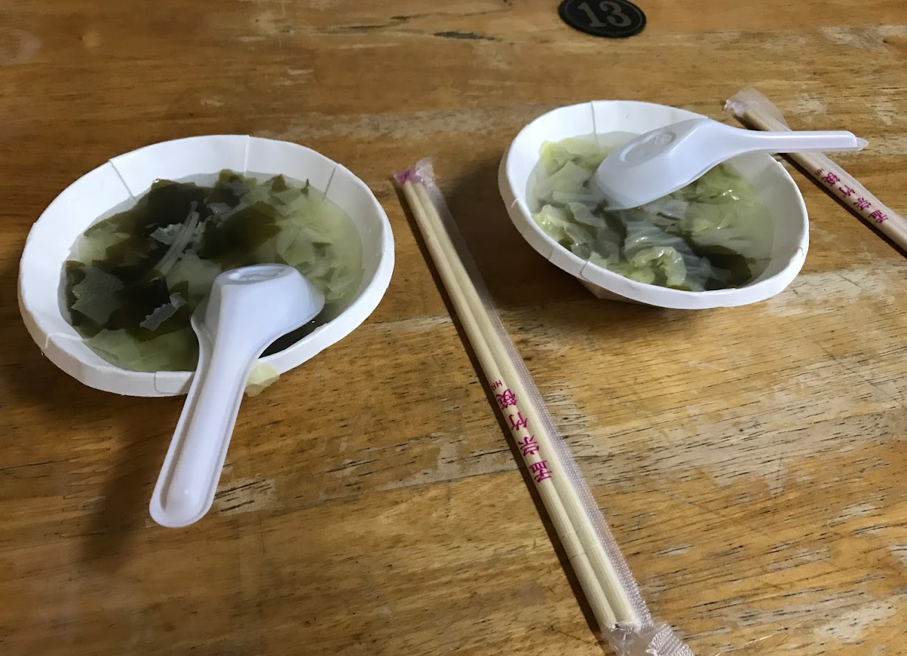 ?黃色小招牌的溫馨小店,被門口的貓頭鷹嚇到,香腸跟豬肉都好吃?、雞湯味道偏淡、自取的紫菜湯滿對我味,環境比較天然夏天偏熱