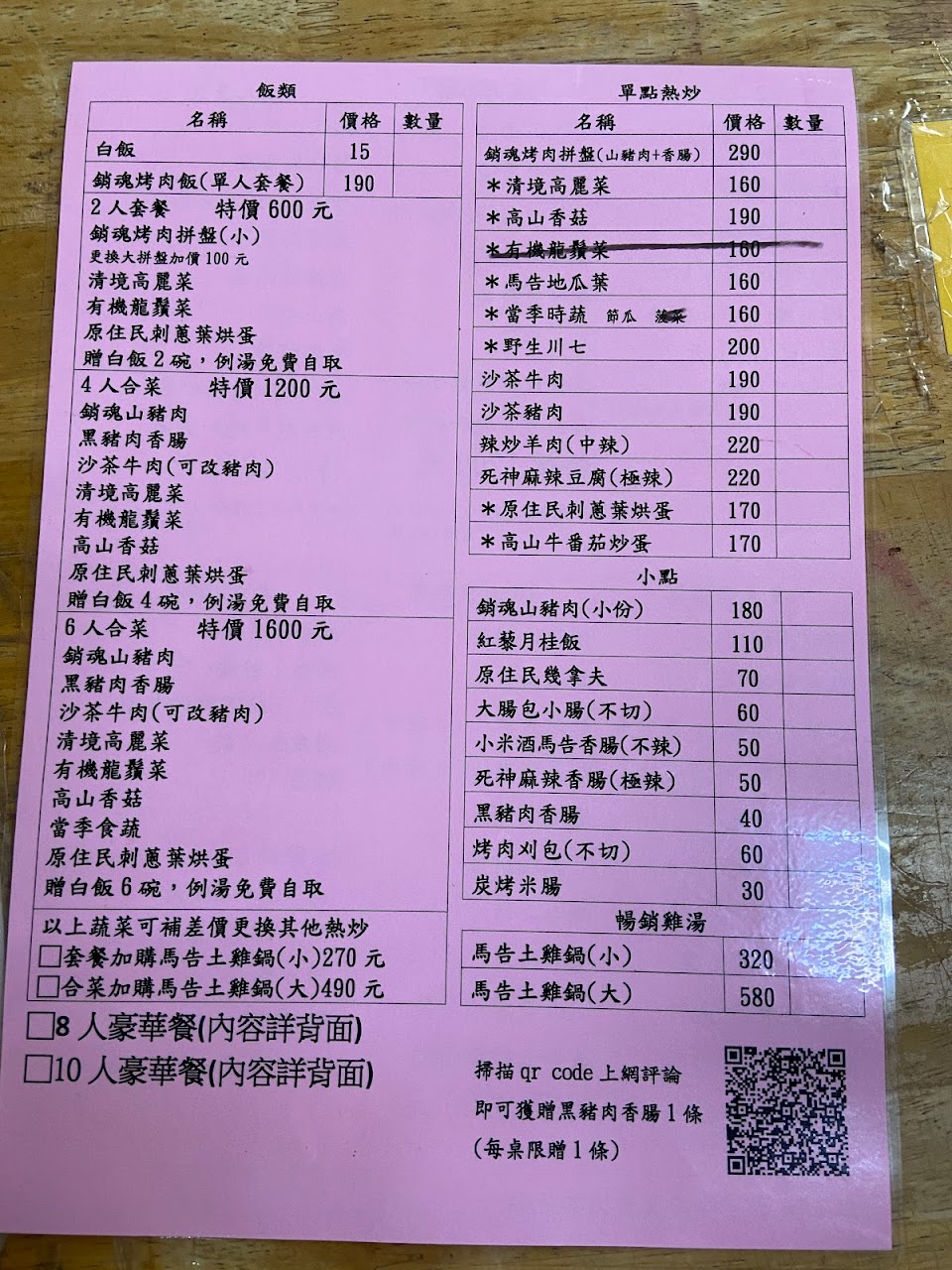 位在清境農場南側入口附近,可以在進入農場或空中步道前先來用餐,這次和老婆兩人餐點是600元的雙人套餐,有白飯,兩道青菜,山豬肉+香腸,刺蔥煎蛋。 餐點的份量很足夠,覺得可以給3-4人吃,其中山豬肉+香腸熟度剛好,調味很夠,另外刺蔥煎蛋的刺蔥香氣讓人印象深刻!搭配煎蛋鬆軟略帶油嫩的口感真的非常好吃!整體來說CP值非常高,用餐環境也不差,中午的生意很不錯,假日要前來時最好先來電詢問。 服務 內用 餐點類型 午餐 平均每人消費金額 $200-400 餐點:5 服務:5 氣氛:5 建議的餐點 山豬肉跟香腸 雙人 套餐