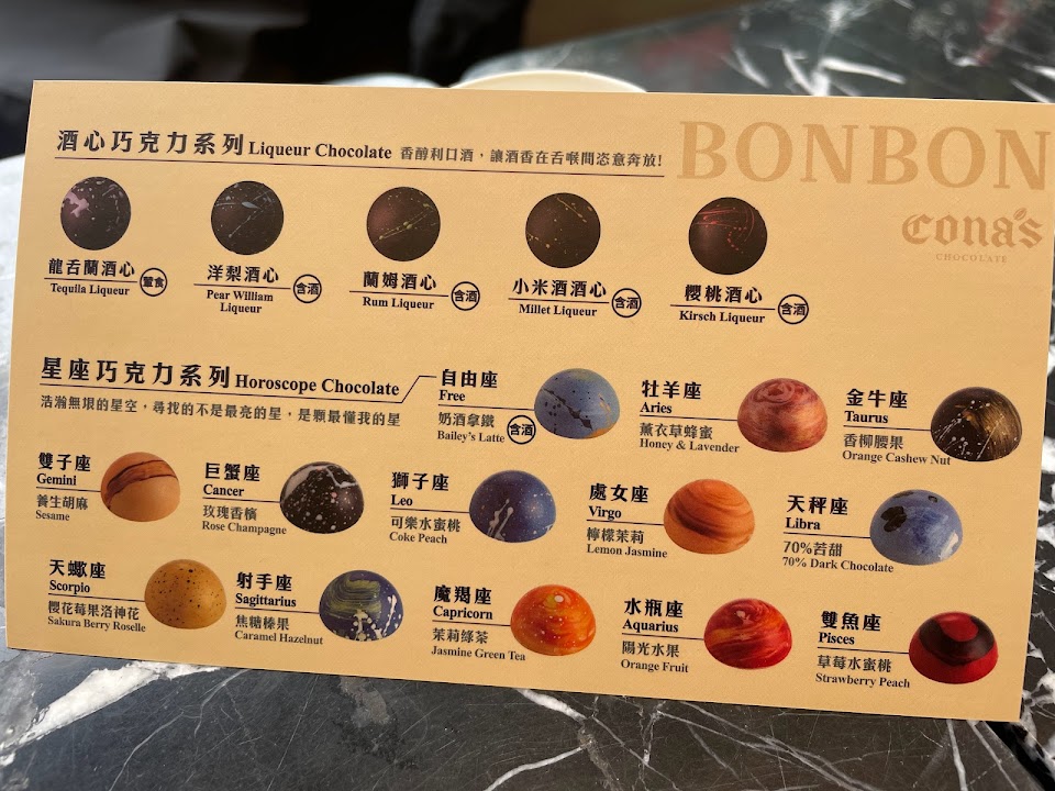 令人驚艷的星座巧克力,不僅外型美麗,口味還很豐富,每一顆都吃得到內餡,層次很多的巧克力。其他得獎的巧克力內餡堅果飽滿,每種口味風味十分鮮明,是很值得造訪的一家店,絕對找得到自己喜愛的巧克力,只怕一不小心就會買太多,買超過一千五百元送保冷袋。