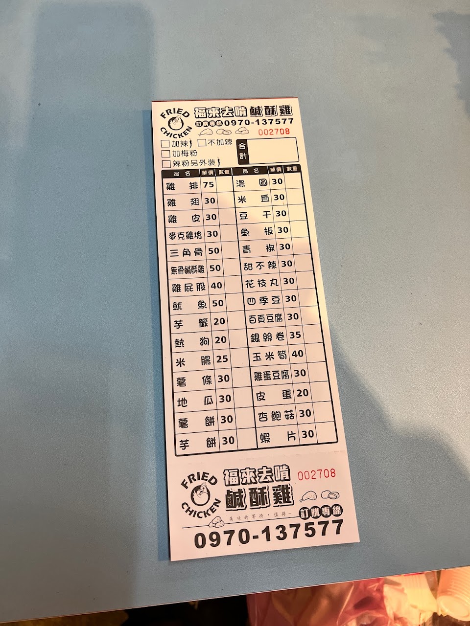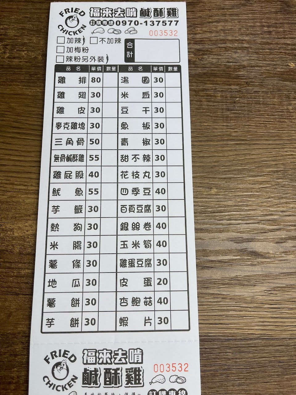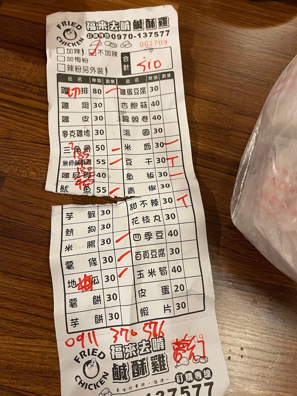 今晚去買了魷魚豆干青椒 玉米筍,結果最想吃的魷魚沒看到,反而變成鹽酥雞,問題我就完全不想吃雞肉,去的時候也沒客人,只做我們的也可以做錯,希望老板能再用點心。