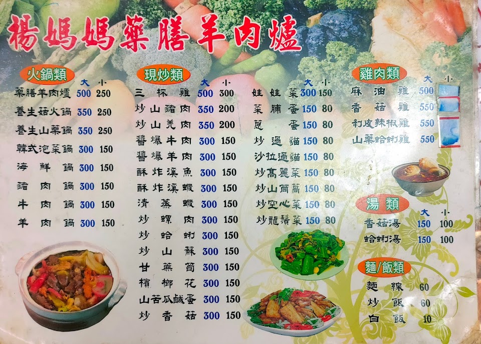 點個大鍋的羊肉爐,一上桌全家傻眼,鍋子就是一般的小平鐵鍋,裡面幾塊羊肉和兩片豆皮和少許高麗菜,湯頭從店外聞很香,但喝起來都沒味道……另外點兩盤炒青菜,只有同意老闆娘把高麗菜升級大盤並沒同意另一盤山蘇也一起升級,結果結帳時,山蘇也升級大盤,這種生意手法令人感到不齒!非常不建議來此地觀光客來這用餐。桌子也都沒有擦,桌巾非常髒,自己消毒桌子的時候,衛生紙都是油垢和髒污。老闆娘炒菜口罩還掛在下巴,很沒衛生