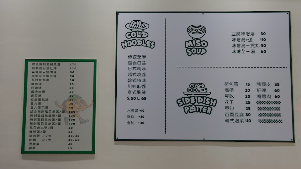 經朋友推薦,初次到訪,涼麵的選擇很多,各國風味也有,最後選了基本款的傳統芝麻,友人推薦韓式辣味,因為肚子太餓,直接把涼麵吃完後才想到沒拍照 ?,芝麻醬香香的,配上帶點Q彈咬勁的麵條很好吃,綜合虱目魚肚粥、麵,除了一大塊虱目魚肚外,還有魚皮、魚柳、魚丸,是想吃虱目魚全餐的好選擇,搭配的麵是意麵,QQ的帶點嚼勁是我喜歡的口感,黑白切也有一定水準,不知不覺切了一大盤,有來北投的話會再來吃~ …