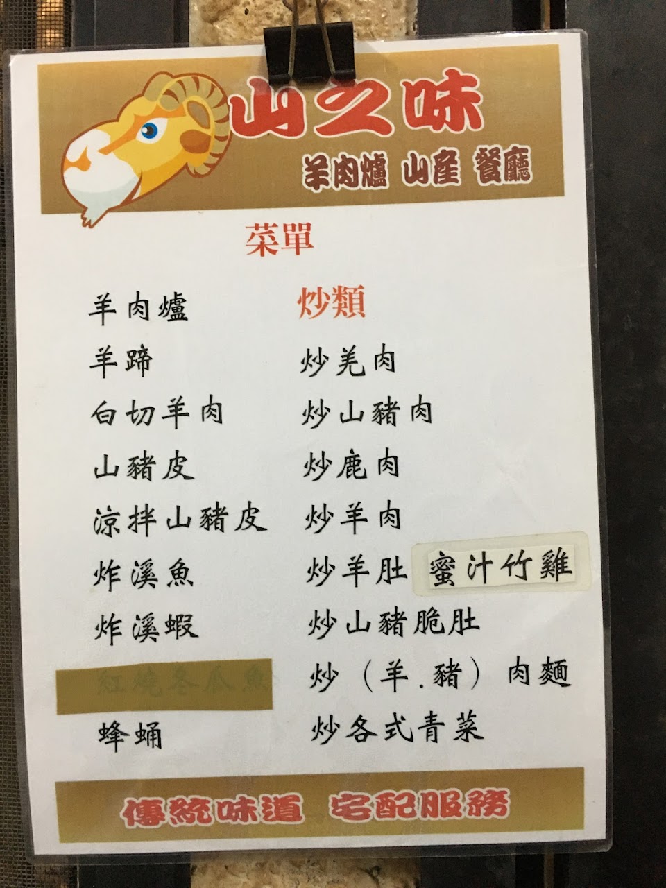 個人覺得炒麵並沒有前面評論說的好吃,不知道是不是因為不是老闆本人煮的! 羊肉爐標價一份$600,肉不多,白菜只有幾片,白蘿蔔卻很多~結帳發現原來是另外要算錢$100,所以羊肉爐1份$700,料少空虛沒有那個價值。 牆上的菜單沒有標價,一份燙山豬皮要$350,雖然處理乾淨不錯吃但還是很貴(建議先詢價)! 一份羊肉爐、一份炒菠菜、一份山豬皮、2份炒麵結帳$1320,吃完反而心裡感覺很空虛! 平均每人消費金額 $400-600