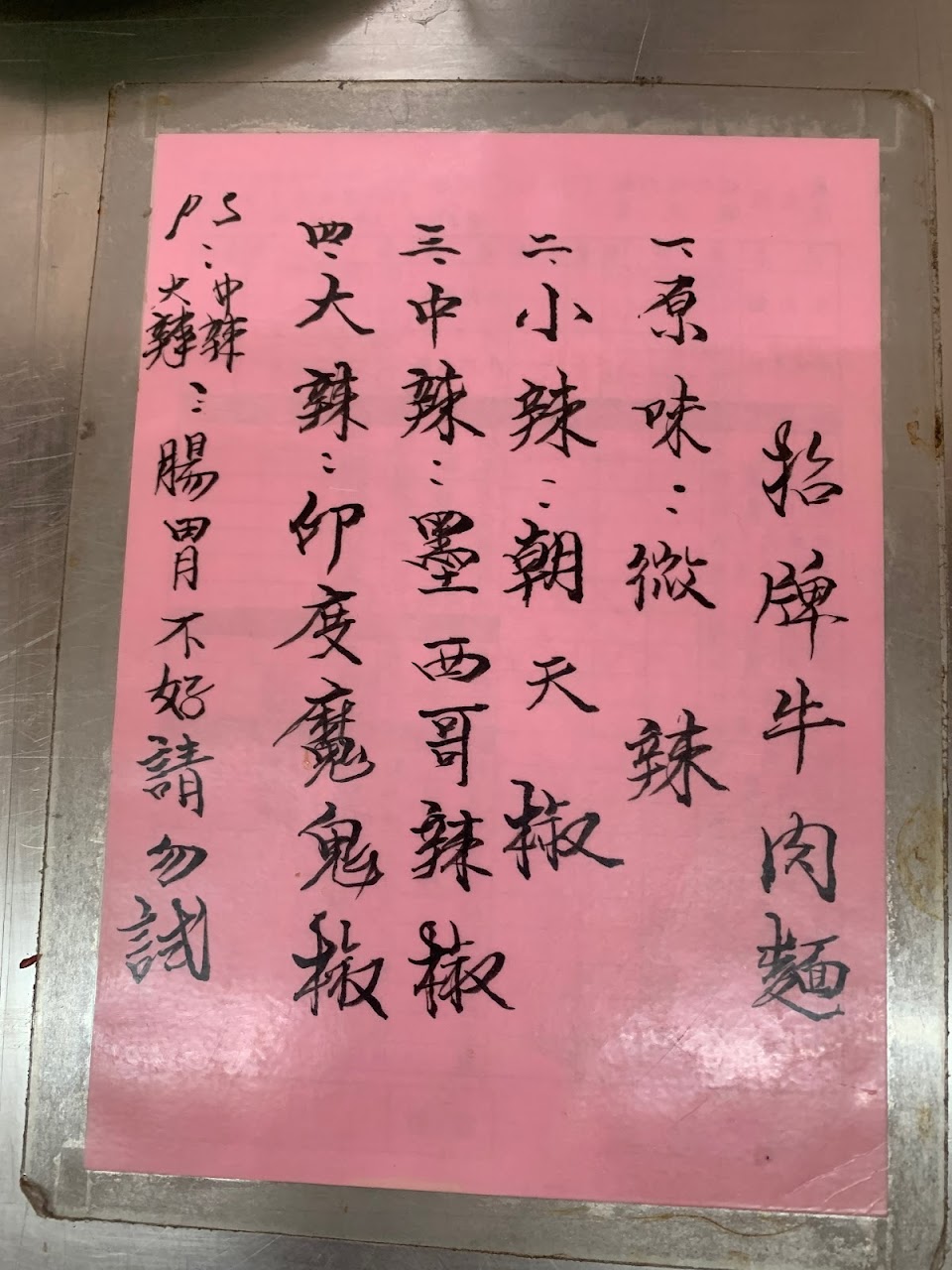 牛肉麵量肉適中,桌子上手寫使用辣椒的種類,愛吃辣的人,可以來挑戰一下大辣