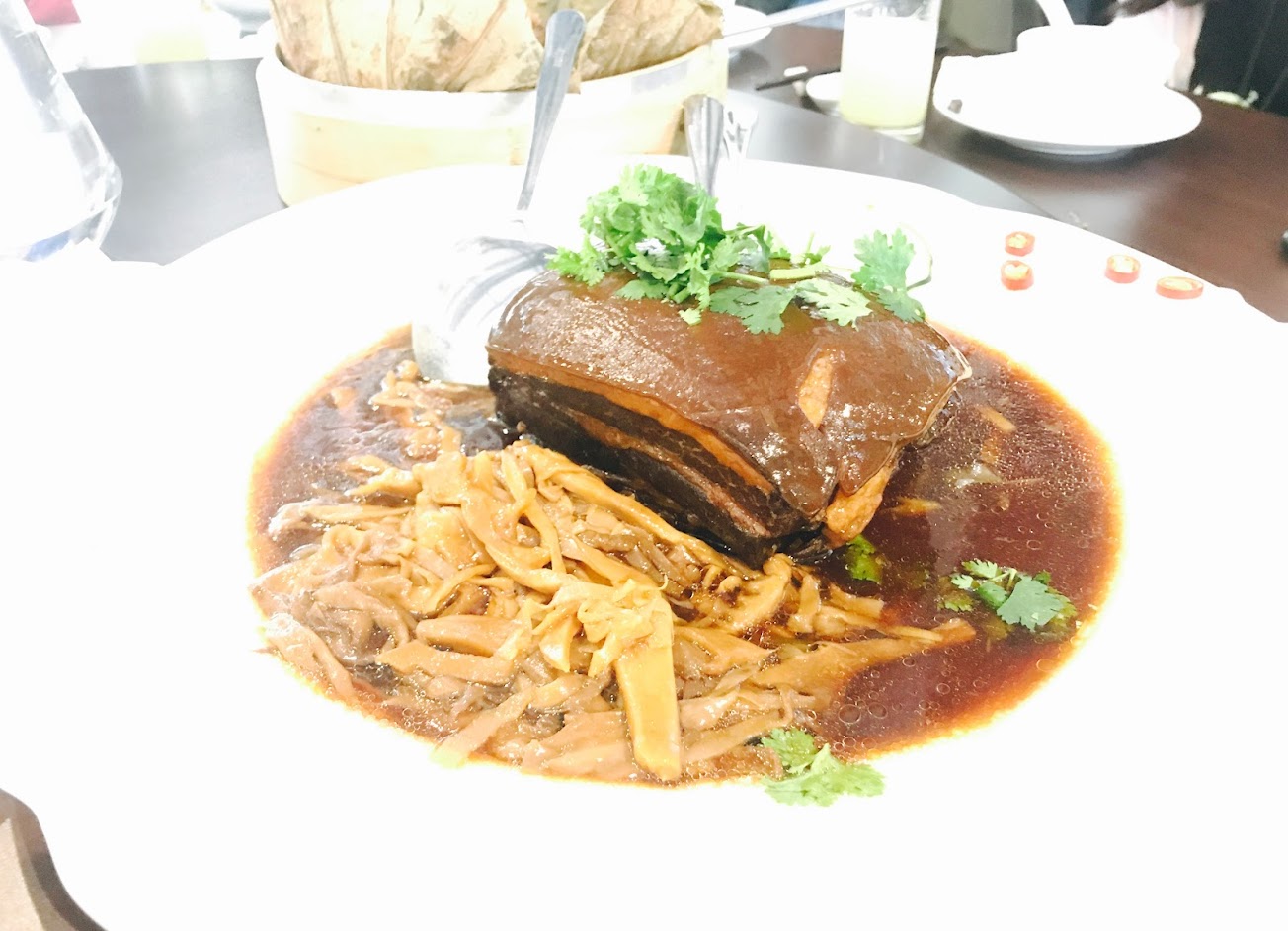 接待人員親切,景觀不錯,但主角食物就沒那麽好。東坡肉未入味、炒飯軟爛、湯品尚可、唯一稱得上好吃就是綠金針。