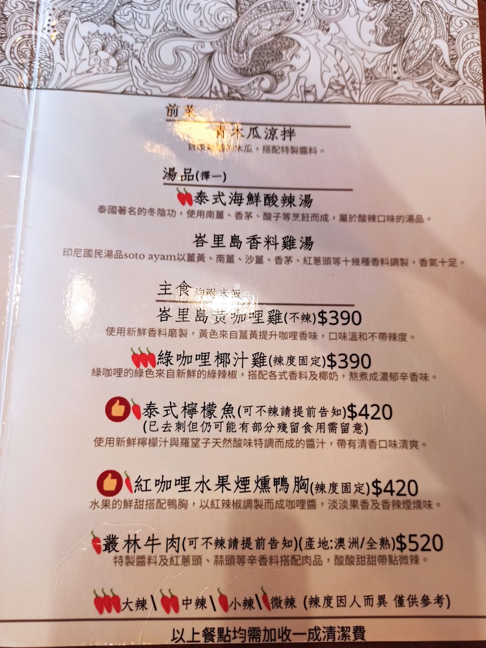 評價有好有壞來之前很猶豫,最後還是決定來看看,結果還好是ok的,點了叢林牛肉(肉不錯好吃),綠咖哩(味道濃郁肉也多 好吃),紅咖哩(有水果味 特別但不愛),環境跟餐點都ok,但有蚊子一直叮咬 可惡,打開送髮夾