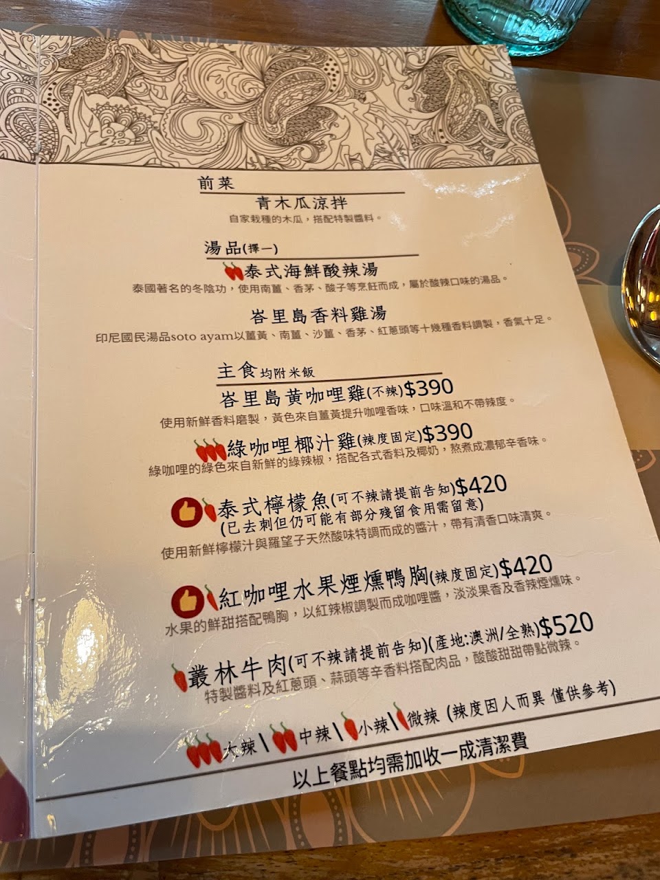 平日來用餐環境好舒服,涼涼的風,搭配南洋風味料理,叢林牛肉很嫩沾醬清爽,泰奶也好喝