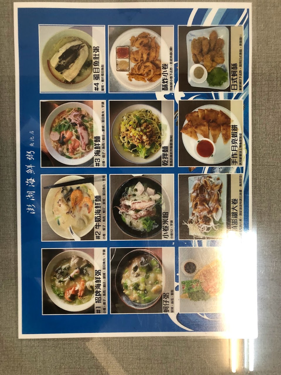 騎機車環島進入魚池鄉市區時,這是最吸引我目光的招牌,畢竟在不靠海的魚池鄉賣澎湖海鮮,實在反差好大;問了一下背包客棧的老闆這間店的味道如何?老闆也大推!於是晚餐決定品嚐看看,看了菜單,點了招牌的海鮮粥,再看了一下其它小菜,南方澳無骨魚肉捲,和外面板子上推薦的蝦排,都很吸引我,問了一下老闆娘無骨魚肉捲是什麼魚?她說是白帶魚,當下就毫不考慮的點了這個無骨魚肉捲與蝦排來品味看看;海鮮粥先上來,裡面有小卷、蛤仔、虱目魚肉塊與魚丸,還有兩隻白蝦,及最特別的芋頭塊;先喝湯頭,可以確定是沒有加味精,芋頭香氣融入湯裡就是一種古早味,海鮮本身鮮甜,價格上也算便宜,CP值很高;而無骨白帶魚肉捲也是很新鮮的海味,蝦排內有滿滿的?與花枝,都吃的出來口感,簡直是令我這個從小吃海鮮長大的,也讚嘆了!下次若再到魚池鄉住宿,一定再去光顧!