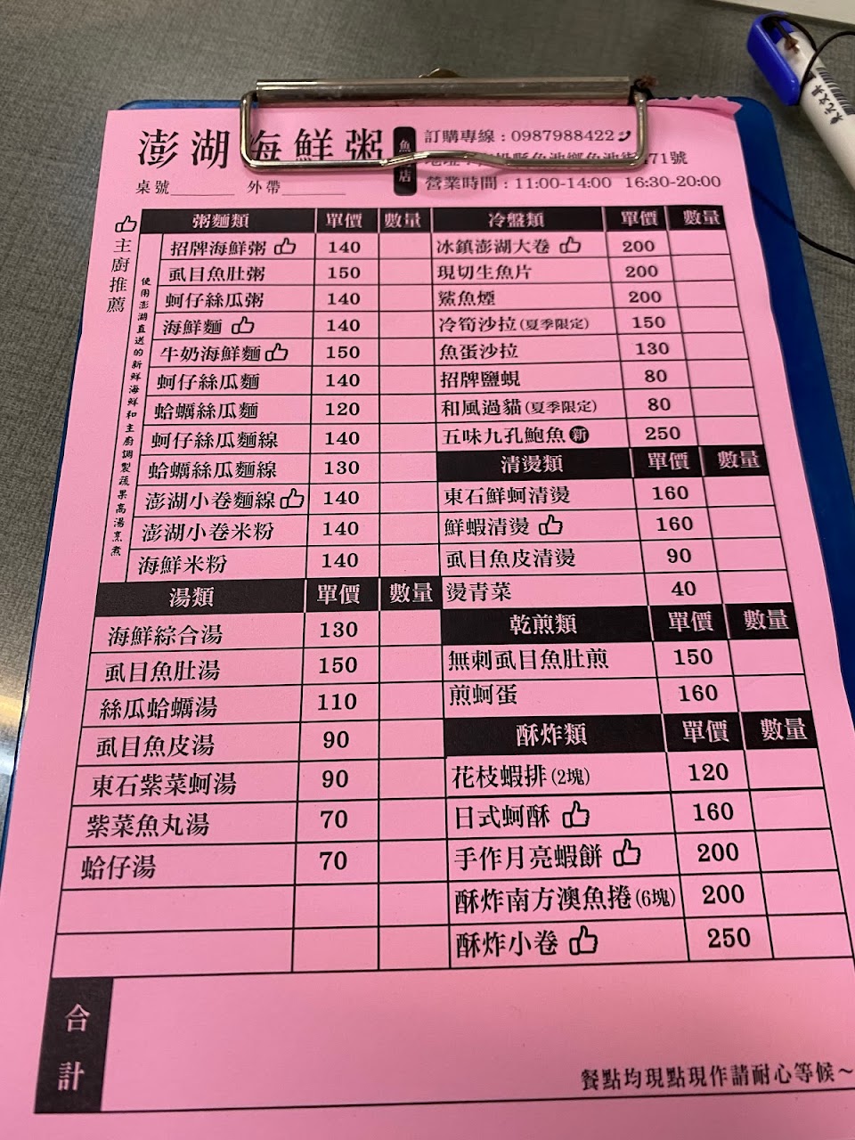 點了海鮮粥、冰鎮大卷,都好吃又新鮮,比在澎湖吃cp高