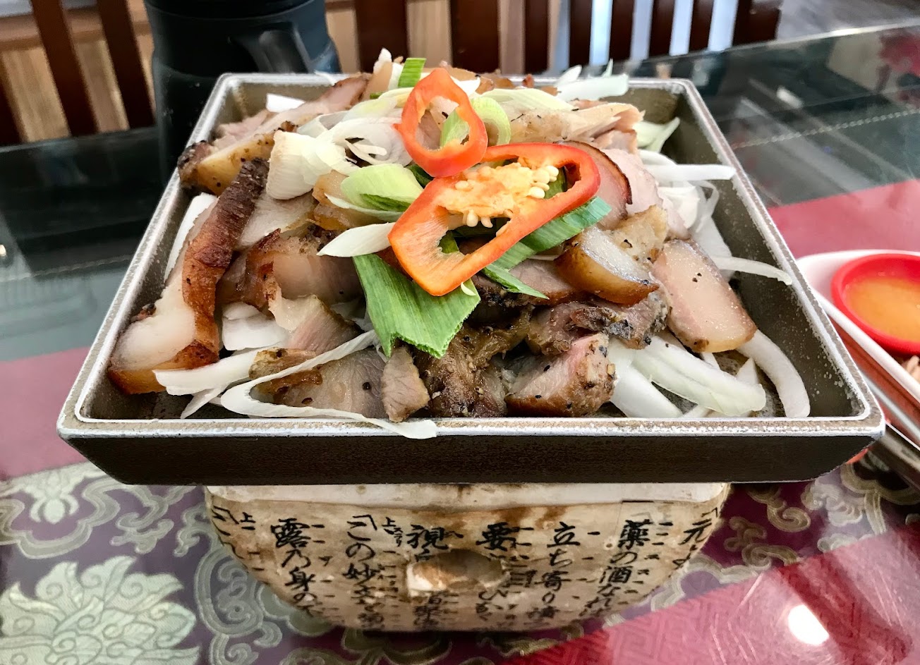 四人點1800套餐,8道菜,超強,每一道都好吃。陶板鹹豬肉,蒸魚,竹筒蝦,青木瓜百香果,油雞,炒青菜,筍湯,香菇滷