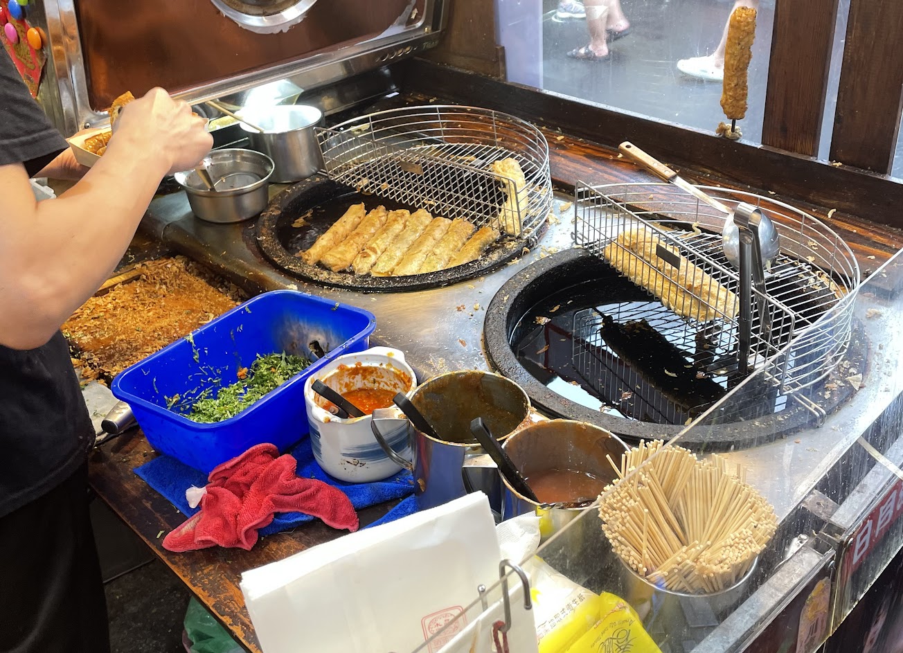 從黃昏逛到入夜,排隊就是美食,人潮就是無敵,跟蝦滑羹是同一店面,但走走逛逛就是想吃小吃,不想吃太飽,只在店外排總統魚酥捲,點了原味+蔥肉口味盒裝,滿滿的香菜(可選擇不加,我們是加滿),太好吃了,忘記手機先吃,哈-20230415
