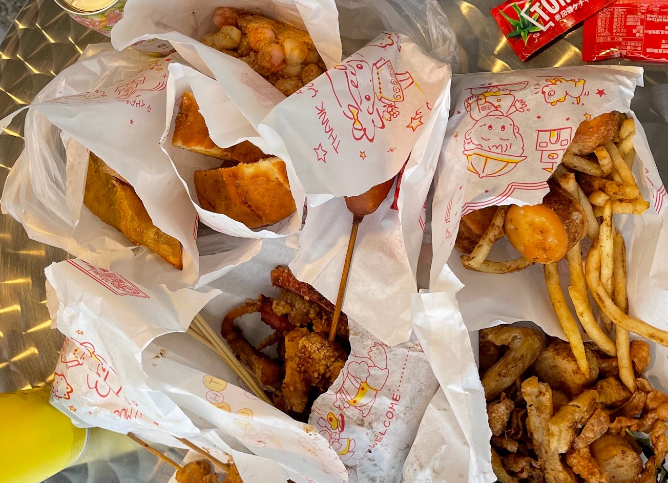 鹽酥雞兩份、百葉、甜芋籤、豆包、雞屁股、肥腸,價錢共$255