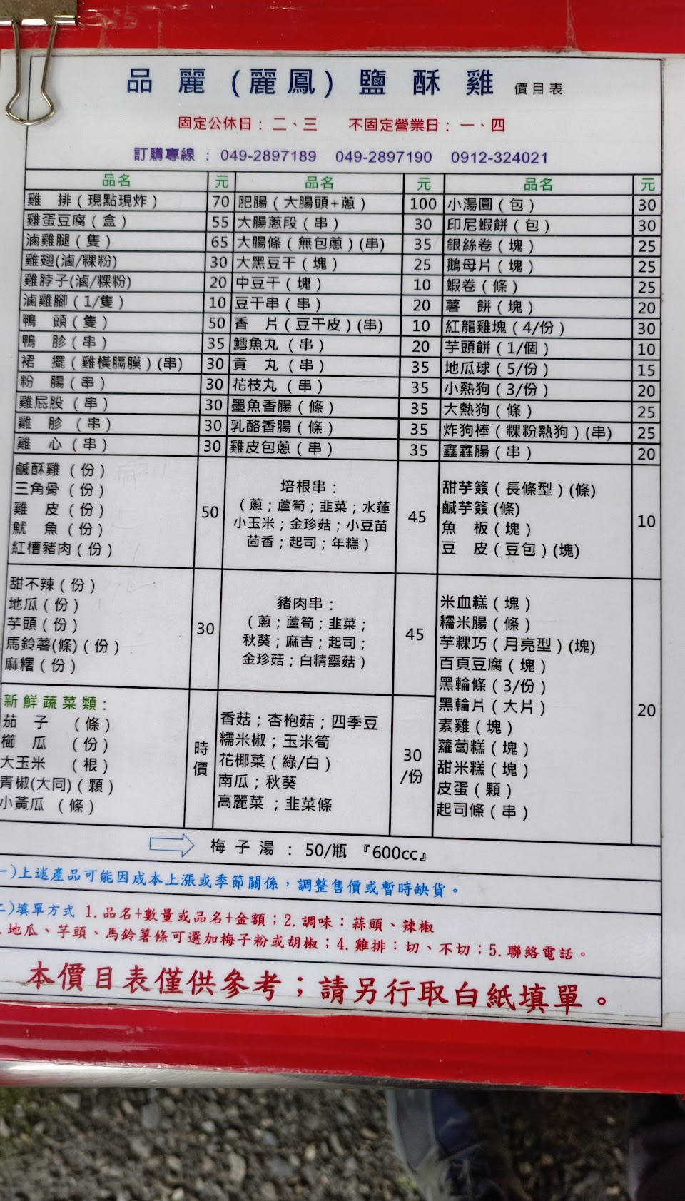 點餐方式是把想點的菜,寫在空白紙上,並留下電話,炸好了會電話通知。