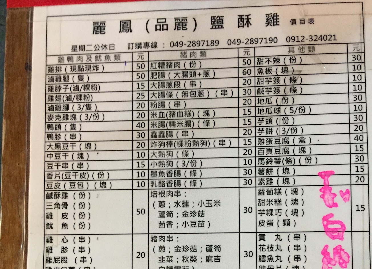 平日電話訂,一個半小時之後可以拿, 要炸跟炸好都有打電話來通知, 很貼心。 不過可能是南投口味,個人習慣鹹甜口味, 所以不習慣麗鳳偏鹹的口味, 不過甜不辣跟紅糟肉都蠻好吃的, 魷魚肉很肥厚。 50塊的量就蠻多的,很推薦體驗看看, 不過最好先確定有沒有休息, 避免跑一趟卻撲空。