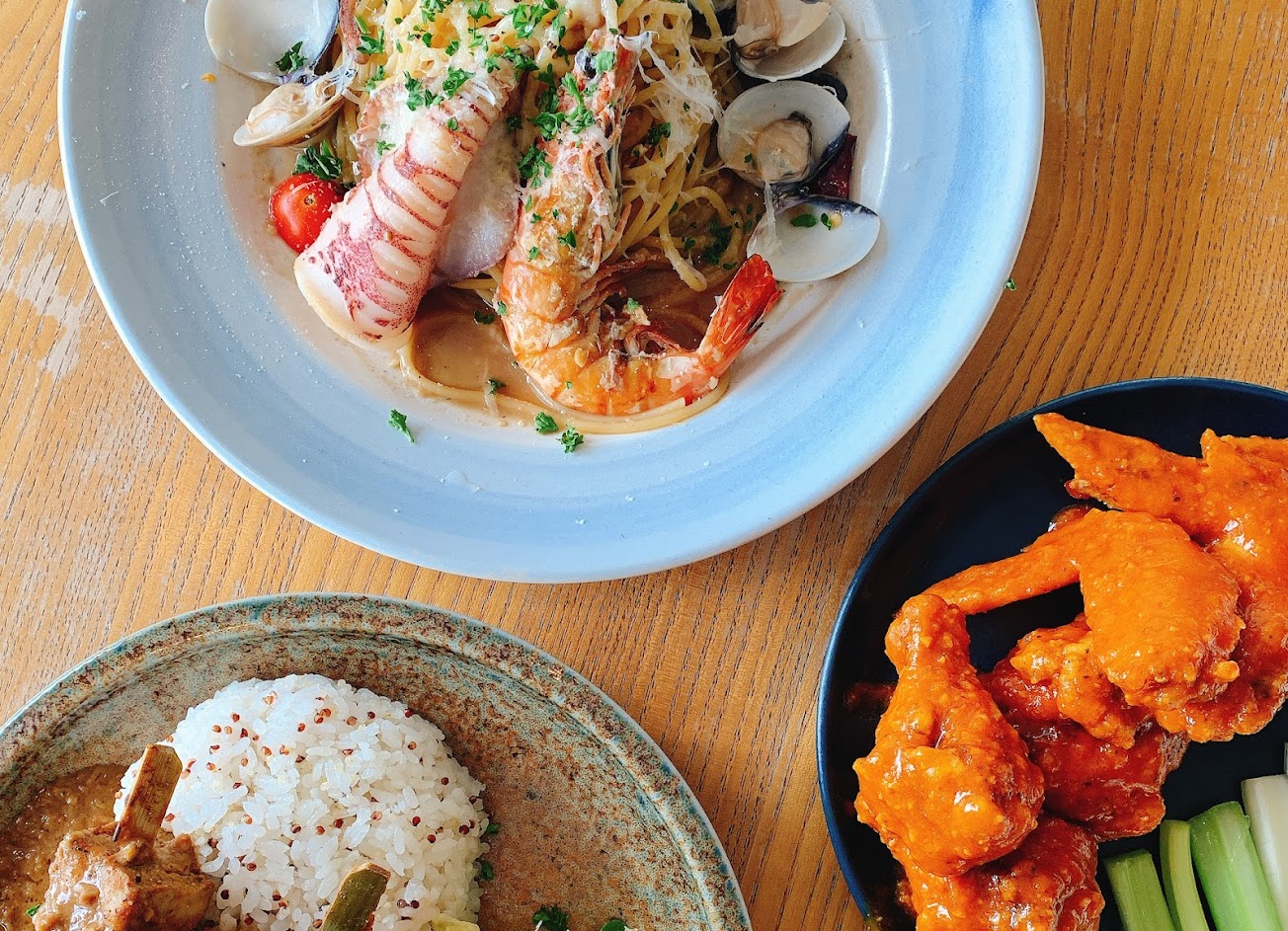 用餐時間,110.10.23餐廳外觀明亮寬敞,裝飾使用木根交疊營造層次感,與福岡太宰府星巴克共同點是使用木根交織,雖然木根數量遠不及星巴克,但也別有一番風味,在前往蠻荒咖啡的路上,我們迷路了三次,因為地址會導航到咖啡廳後面的有水巷,正確位置在台21號省道上,大家可別走錯囉,回歸正題,蠻荒咖啡一直都是網美集散地,就算非用餐時間,人潮依然眾多,今天候位大概35分鐘,餐點為:🐔泰式椒麻轟炸雞、深林牛肝菌義大利麵🍝、漁夫蒜辣海鮮🦐義大利麵,三個餐點我們一致認同泰式椒麻轟炸雞🍗是今天的冠軍🏆,仔細看我娓娓道來,並不是牠特別好吃,而是因為其他兩個表現平平,🈶️一道餐點🍴則是今天的敗筆,深林牛肝菌義大利麵牛肝菌味道很重,這個部分並非每個人都能接受,我個人是可以接受的,而調味部分我真的不行❌,過鹹過油不爽口,吃一口要配一杯水🧊,像是味素🧂放很重在口中會跟麵體打架一樣;漁夫蒜辣海鮮義大利麵表現一般般,海鮮🈶️新鮮基本上就70分了,調味部分主要以🧄蒜辣為其名,但蒜頭味跟辣椒🌶️都很淡,男友是只能吃微辣的人,他說要不是餐盤🈶️看到乾辣椒,他真的不會感覺這道菜🈶️放辣椒;而泰式椒麻轟炸雞,主要椒麻的味道過於清淡,入口沒有椒麻感,但整體上是好吃😋的。 不過該替蠻荒說個話,畢竟人家的招牌是以咖啡為主,我們因為早上喝過咖啡☕️,所以午餐就沒有再喝一杯,不然就過量了,下次有機會🤔再來喝看看咖啡好了。