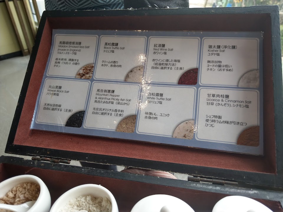 料理上,採用全部煎熟,再讓顧客從4種鹽去挑選自己喜歡的,沒有其他醬汁或變化,感覺師傅並沒有用心去研究。以羊羔排為例,少了紅酒浸泡,加上切成小塊再以大火煎至全熟,放在瓷盤,不到幾分鐘,已經乾硬到難以入口,我們只是純粹不浪費食物才吃完的。