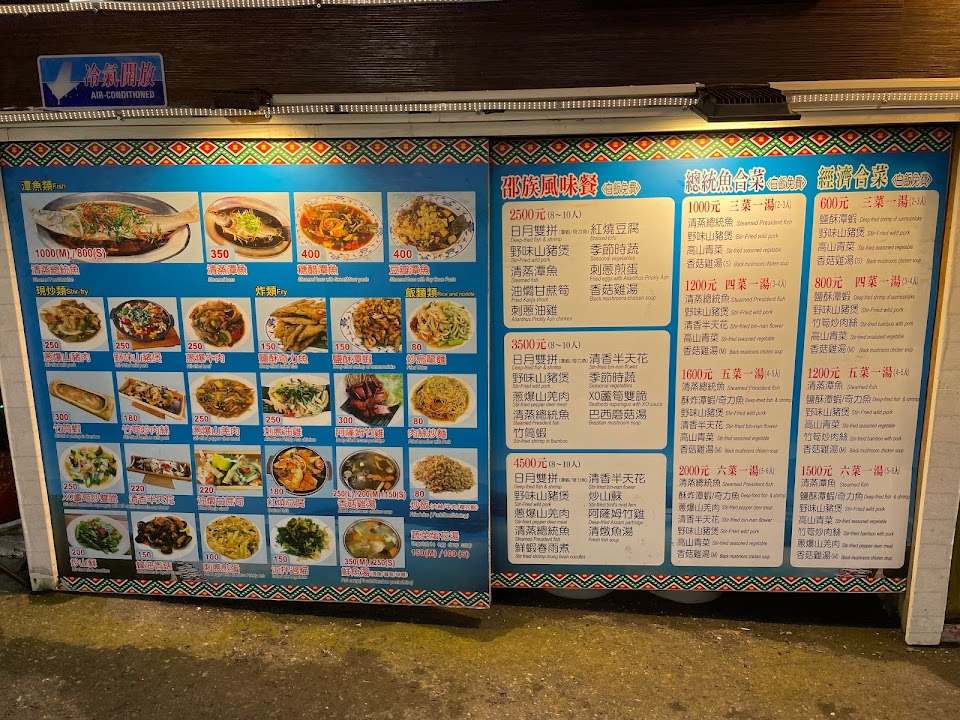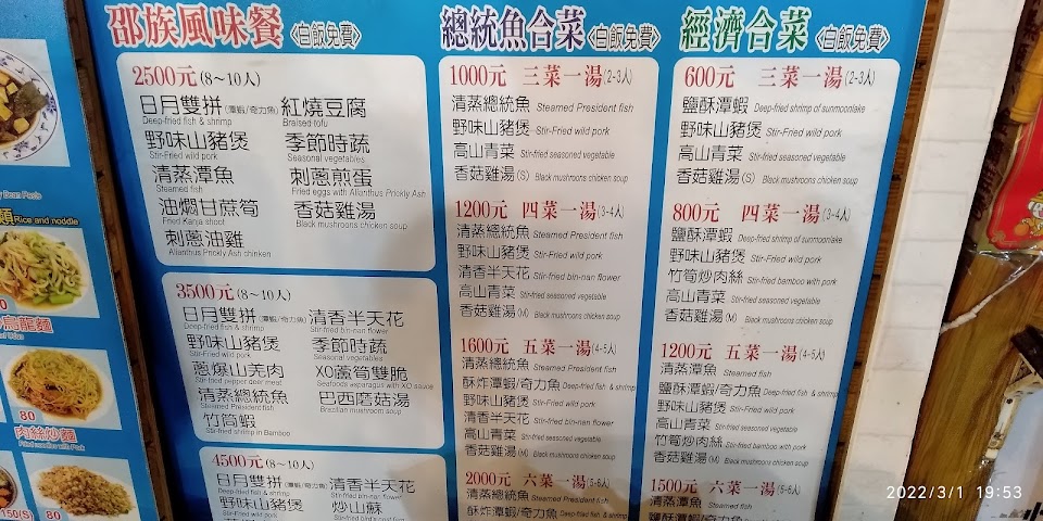 住宿旅店配合的餐廳,提供三菜一湯,青菜會依當天有的讓客人挑選,另外溪蝦、山豬肉跟湯則是固定菜色。 雖說是與旅店,但店家也一點都不馬虎,不論是味道或份量都很到位,兩個人吃真的很撐。白飯部份是自取吃到飽,菜都是現炒但上菜速度很快,店家態度也很和氣。 而且店內非使用一次性餐具,用餐環境也整齊乾淨。人少吃不多可選擇單點炒飯之類的,人多有選擇障礙時可參考店家幾款多人套餐也很方便。