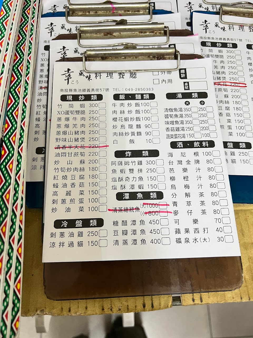住宿旅店配合的餐廳,提供三菜一湯,青菜會依當天有的讓客人挑選,另外溪蝦、山豬肉跟湯則是固定菜色。