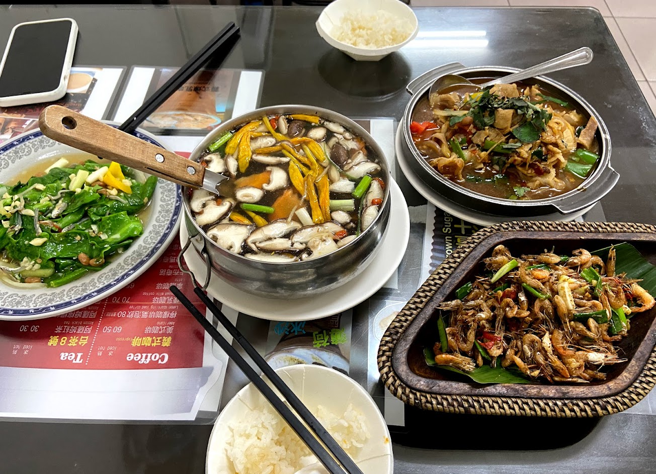 快速的服務。我們吃了當地的糖醋魚、當地的鳳尾魚、炒野豬和山薯。一切都非常好。還買了一瓶當地的米酒,300T$。有點酸但是很好吃。